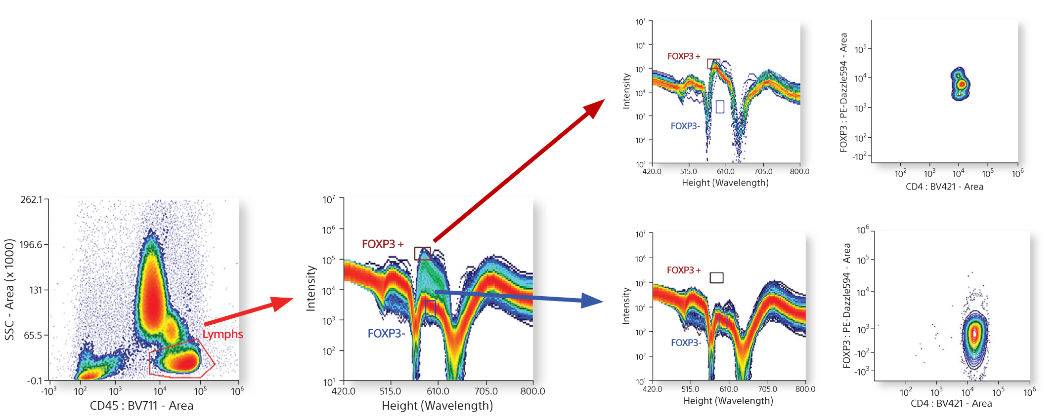 The SP6800 spectral flow analyzer improves sensitivity and simplifies application design, workflow, and analysis over conventional flow cytometers. This is achieved using spectral analysis technology, advanced electronics, and patented optical technologies. These capabilities, unique to Sony Biotechnology systems, allow experienced and novice flow cytometrists to achieve greater flexibility for panel design and more accurate visualization of results.