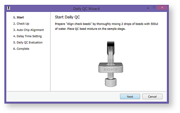 At start up Align Check and Performance QC wizards check instrument calibrations, using beads to ensure the instrument is operating optimally. On screen instructions guide the user through procedures, then display progress and report results. The performance report displays MESF, Q, and B values to describe real-time fluorescence detection performance. If desired, Align Check and Performance QC reports can be displayed in historical context.