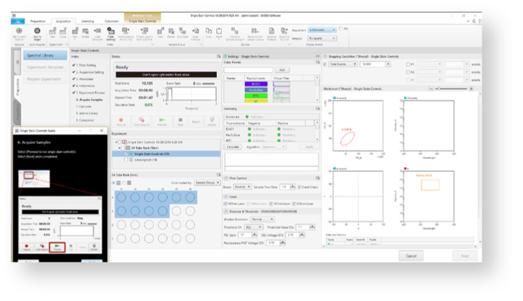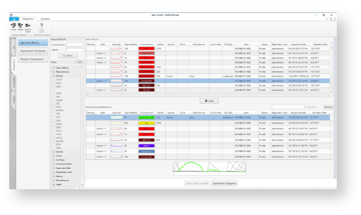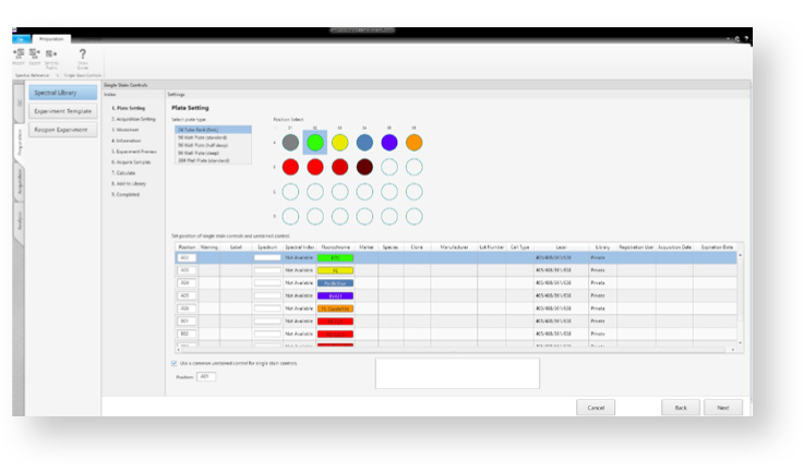 The Spectral Library lets users create a personal reagent library that simplifies experiment creation and saves time. An Acquisition Wizard assists the users with step by step instructions to acquire and analyze single positive controls for your spectral library. Once acquired the spectral reference for that reagent including the spectral index are available for future use. Information from the spectral library is available to users with a simple click improving accuracy and streamline panel design.
