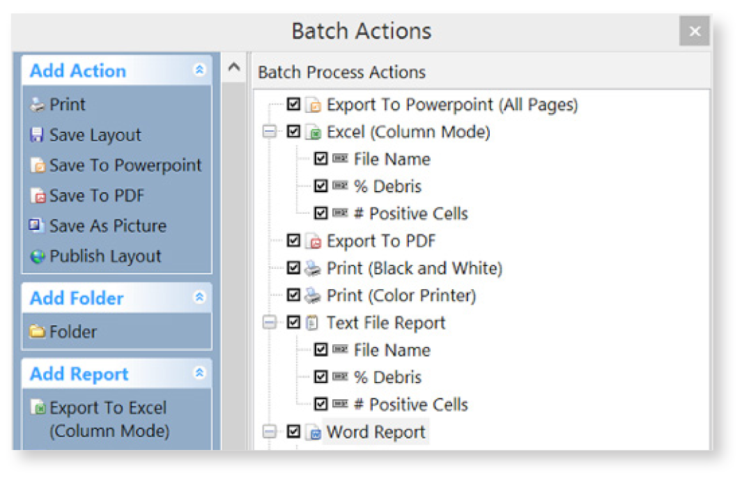 Batch analysis lets you process any number of samples with one click. To support presentation, data can be exported directly to PowerPoint, PDF, and Excel.
